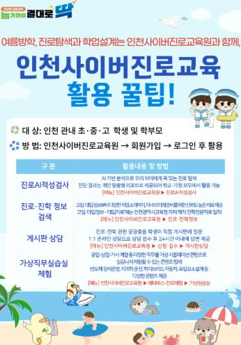 인천시교육청 관계자는 “미래를 준비하는 학생들이 인천사이버진로교육원을 많이 활용했으면 한다”며 “여름방학을 활용해 학생들이 자신의 꿈을 구체화하고 자신감 있게 진로를 설계하길 바란다”고 말했다.