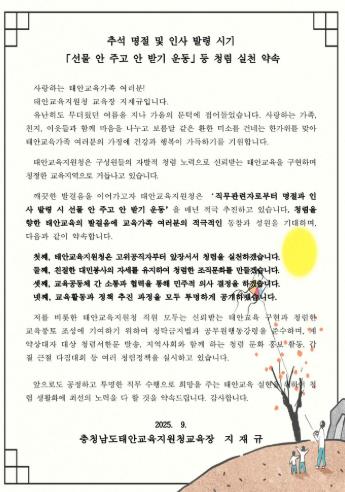 이번 서한문에서 지재규 교육장은 “고위공직자부터 앞장서는 청렴 실천, 친절한 대민봉사, 민주적 의사결정, 정책 추진 과정의 투명한 공개”를 약속하며, 교육가족의 적극적인 동참을 당부했다.