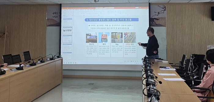 이날 교육은 2026년도 수거보상제 ▲사업운영 개요 ▲보상금 지급기준 ▲정비대상 불법광고물의 종류 및 주의 광고물 ▲안전사고 예방 요령 ▲수거보상금 신청 및 지급 절차 등 내용으로 구성됐다.