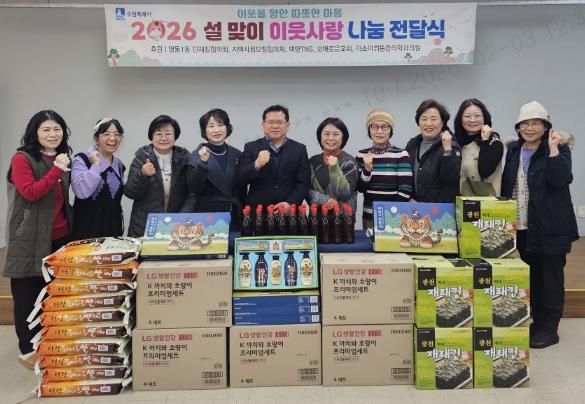 이번 나눔은 영통1동 단체장협의회와 지역사랑보장협의체, 백양TNS, 보배로운교회, 미소마취통증의학과의원이 뜻을 모아, 지역 내 어려운 이웃들에게 따뜻한 명절을 선물하고자 마련됐다.