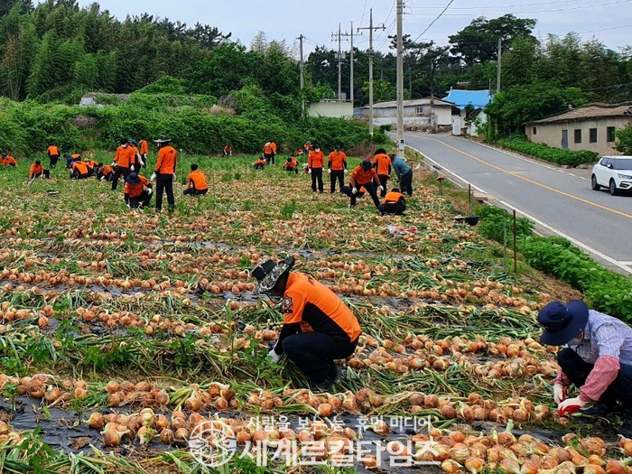 이날 군서면 장경조씨 농장에서 양파 수확 작업에 함께 한 영광소방서 직원들은 더운 날씨에도 마스크를 착용하고 코로나19 방역수칙을 준수했다.