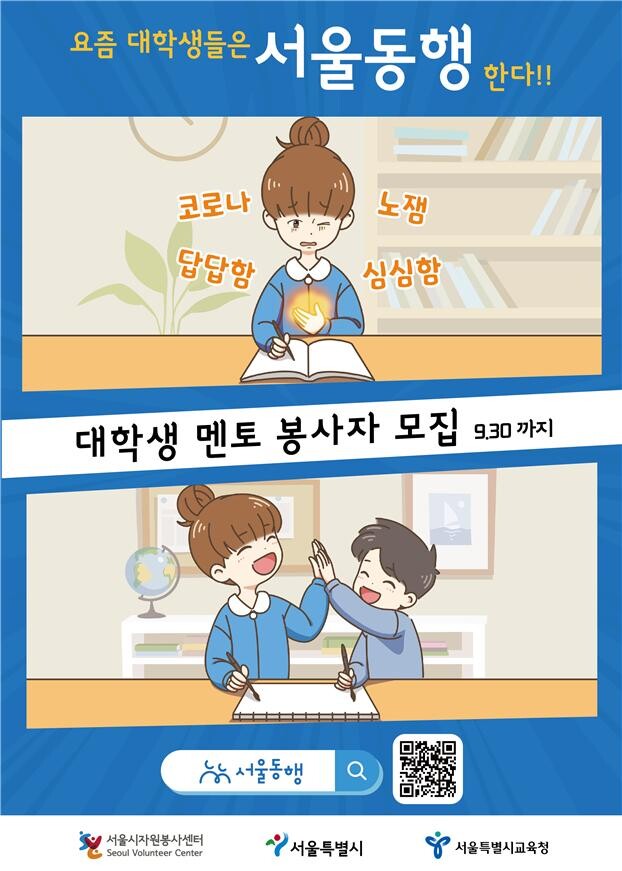 [세계로컬타임즈 이효진 기자] 서울시자원봉사센터는 2학기 초·중·고생의 학습지원 및 정서적 지지와 대학생의 자기주도적 멘토링 봉사 경험을 이어나가기 위해 ‘서울동행 멘토링 봉사활동’에 참여할 대학생 멘토 봉사자를 모집한다.