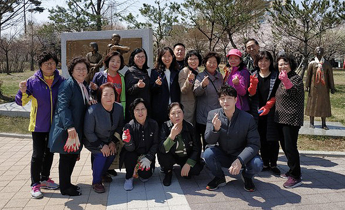 | ▲ 인천 부평구 부평3동 통장자율회 관계자들이 부평공원의 평화의 소녀상 등에 대한 청소를 실시하고 있다.(사진=부평구 제공) |