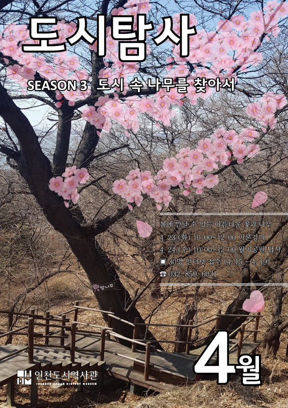 4월에는 월미공원 일대의 ‘봄에 만날 수 있는 아름다운 꽃과 나무’이야기를 들어보고, 시민들과 함께 직접 걸어볼 예정이다. 23일 10시 인천도시역사관 3층 중강의실에서 이론 교육을 진행하고, 이론교육 참가자에 한해 24일 10시부터 월미공원 도보답사를 진행한다.