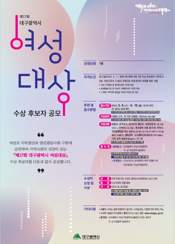 대구시 여성가족청소년국 관계자는 “지역사회 발전을 위해 헌신한 여성을 대상으로 많은 사람들의 귀감으로 삼기 위해 매년 ‘여성대상’을 시상하고 있다”면서 “여성의 지위향상과 양성평등사회 구현을 위해 공헌한 여성은 적극 추천하기 바란다”고 말했다.