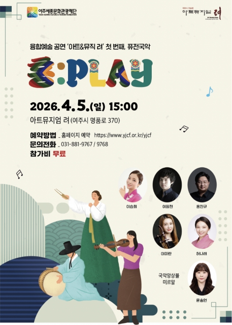 ‘아트&뮤직 려’2026년 첫 번째 공연은 전통과 현대의 감각을 결합한 퓨전국악 ‘흥 : PLAY’라는 주제로 프로그램을 구성했으며, 타악 이필천 / 소리 이승희 / 해금 이미란 / 피리 박준구 / 피아노 윤송언이 참여한다. 이번 공연은 흥과 리듬이 살아있는 퓨전국악 무대를 통해 관람객에게 풍성한 음악적 경험을 선보이며, 봄 시즌 프로그램의 시작을 알릴 예정이다.