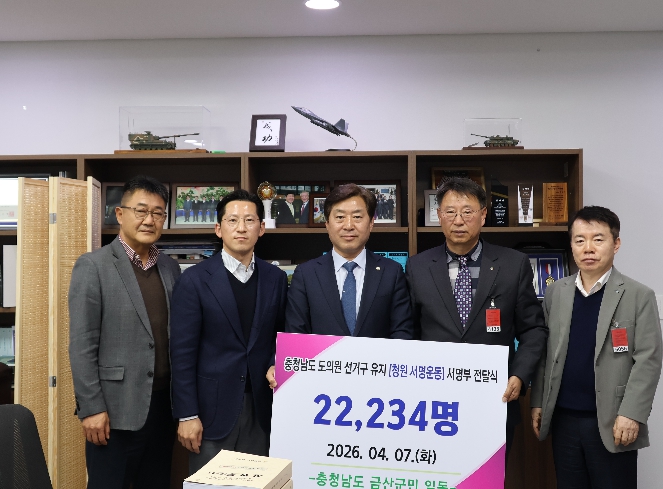서명부를 전달받은 황명선 국회의원은 “군민의 뜻을 모은 서명부를 정개특위에 전달하고 금산군의 의지를 알려 도의원 정수가 유지될 수 있도록 노력하겠다”고 밝혔다.