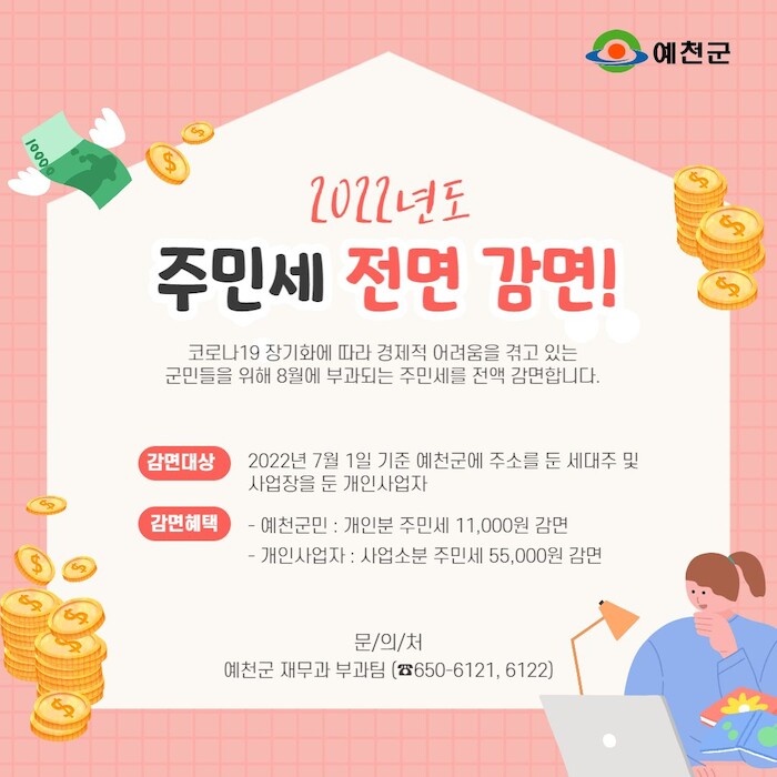 감면대상은 2021년 7월 1일 기준 예천군에 주소를 둔 세대주에게 부과되는 개인주민세 1만1천 원과 개인사업자에게 부과되는 사업소분 주민세 기본세액 5만5천 원으로 감면액은 약 3억6,000만 원 정도다.