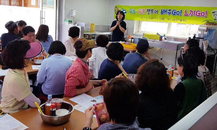 | ▲ 지난 2일 여수시 농업기술센터 관계자가 귀농·귀촌 팸투어 참가자들에게 고추장 만들기 체험교육을 진행하고 있다.<사진제공=여수시청> |