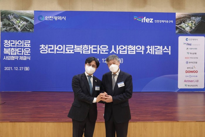 지난 27일 청라국제도시 로봇타워에서 인천경제자유구역청이 주관한 청라의료복합타운 사업협약 체결식이 진행됐다.