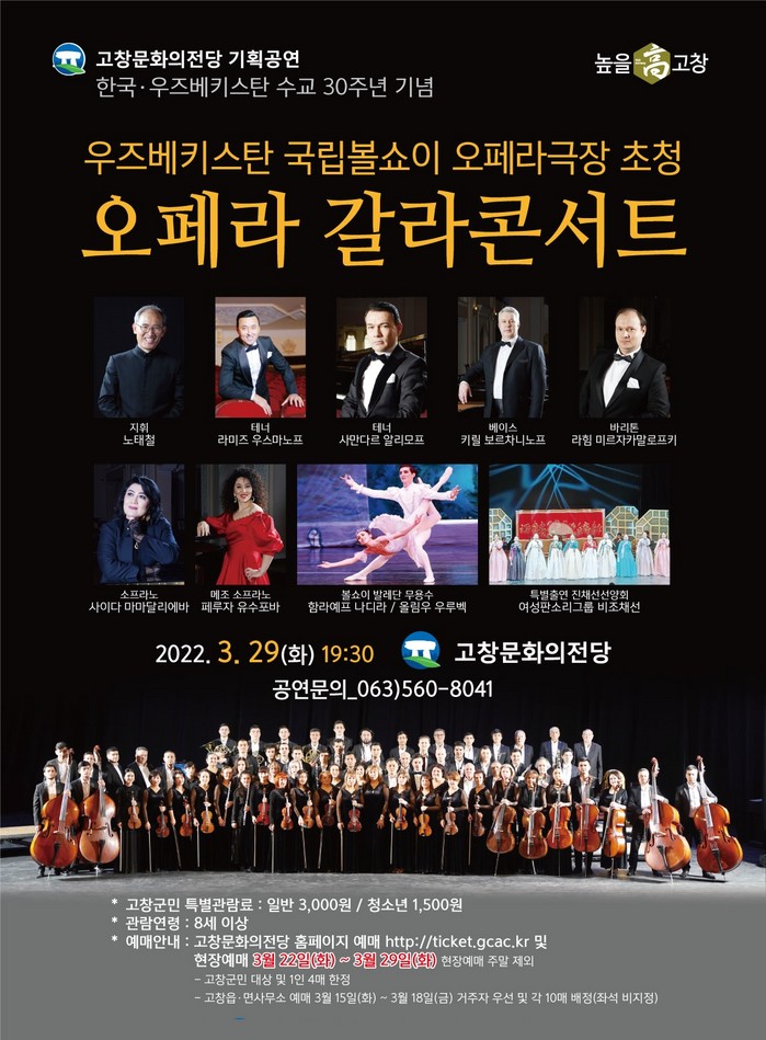 24일 고창군에 따르면 이번 공연은 고창문화의전당 새봄맞이 기획공연으로 100여년의 역사를 자랑하는 ‘우즈베키스탄 나보이 국립볼쇼이 오페라‧발레극장’을 초청해 오는 29일 오후 7시 30분, 세계 오케스트라 무대에서 활동하고 있는 노태철 지휘자와 63인조 오케스트라, 성악가 6명, 무용수 2명 등이 협연하는 ‘오페라 갈라콘서트’를 개최한다.