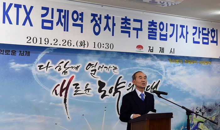 | ▲ 박준배 김제시장이 지난 2월 26일 KTX 김제역 정차를 촉구하며 기자들을 만나고 있다.(사진=김제시 제공) |