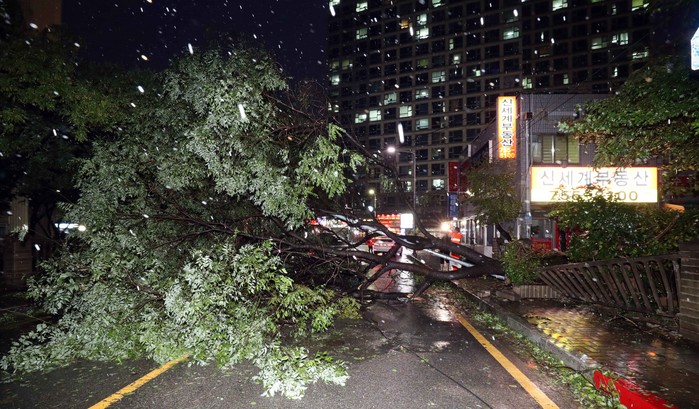 | ▲ 제17호 태풍 '타파'(TAPAH)의 영향으로 '태풍경보'가 발령돼 부산 수영구의 한 아파트 가로수가 강풍에 쓰러져 도로를 가로막고 있다. (사진=뉴시스) |