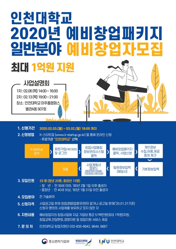 한편, 인천대는 오는 13일 오후 7시에 미추홀캠퍼스 창업다락에서 사업설명회 및 사업계획서 작성방법 등에 대한 교육 및 1:1 맞춤 상담을 진행한다.