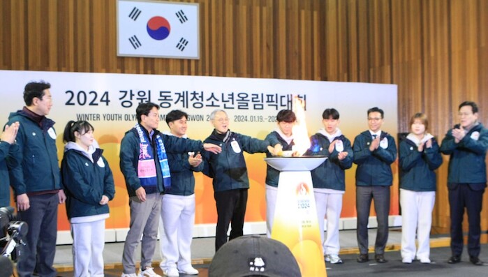 ▲지난 11월 28일 강원 원주시 육민관고등학교에서 '2024 강원동계청소년올림픽' 성공 개최를 위한 성화투어 모습. '2024 강원동계청소년올림픽'은 오는 19일부터 2월 1일까지 강원도 평창군, 강릉시, 정선군, 횡성군에서 열린다. (사진=뉴시스) |