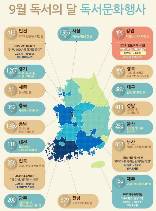 전국 17개 지자체와 교육청, 소속 도서관 등에서는 지역 독서 대전, 퀴즈대회, 공연, 체험 행사 등 흥미로운 독서문화 행사를 개최한다.