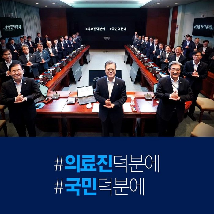 | ▲ 지난 27일 문재인 대통령과 청와대 각료들이 ‘덕분에 챌린지’를 하고 있다. (사진=청와대 제공) |