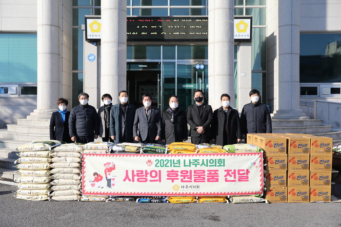 [세계로컬타임즈 강석운 기자] 나주시의회(의장 김영덕)는 27일 의회 청사 앞에서, 연말 코로나19와 겨울한파로 어려운 이웃에게 식료품을 후원하는, 후원물품 전달식을 진행하며 한해를 마무리 했다.
