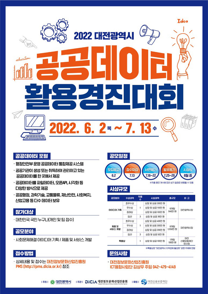 [세계로컬타임즈 민순혜 기자] 대전시와 대전정보문화산업진흥원은 공공데이터 활용 증진을 통해 빅데이터 저변을 확대하고, 데이터경제 활성화를 위해‘2022 공공데이터 활용 경진대회’를 개최한다고 2일 밝혔다.