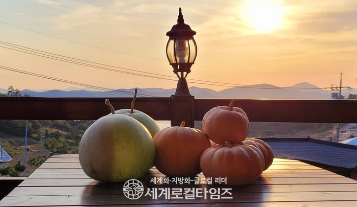 | ▲늙은 호박 몇덩이가 놓인 탁자위에 석양이 머물고… 한 장의 정물화를 보는 듯한 장면에 언뜻 동요 한편이 스쳐간다. |