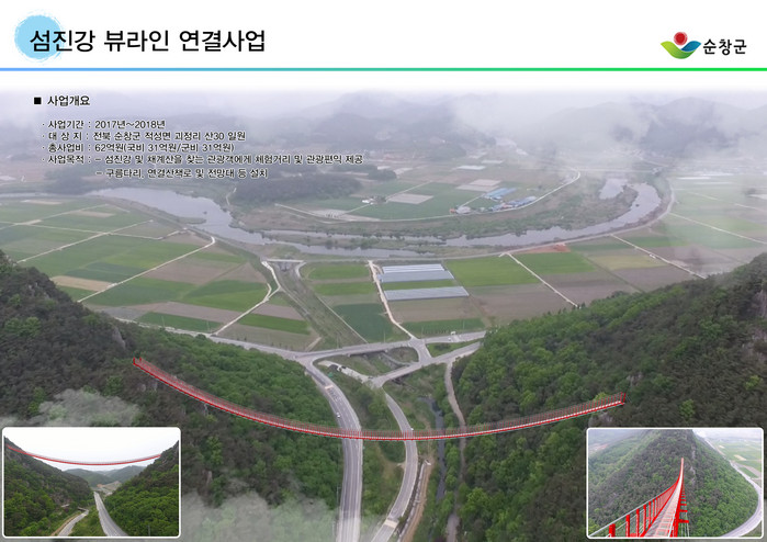 13일 순창군에 따르면 섬진강 뷰라인 연결사업은 적성면 괴정리에 위치한 채계산 중턱 60~65m 지점에 구름다리와 산책로, 전망대를 설치하는 사업이다.