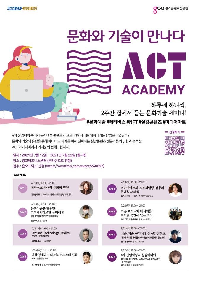 문화기술 관련 산업 동향 및 사례를 주제로 메타버스(가상현실 기술을 활용해 가상세계에서 현실처럼 교류), 미디어아트 전문가 등을 초청해 온라인 강연 형식으로 진행한다.