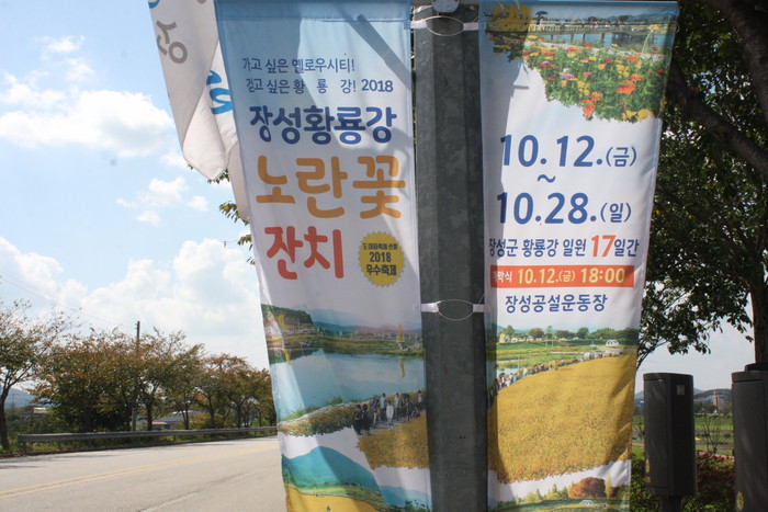 | ▲황룡강 노란꽃잔치 현수막이 관람객들을 맞을 준비를 하고 있다. (사진=유영재 기자) |
