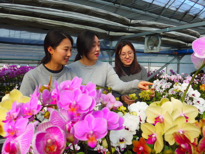 | ▲ 경기도농업기술원 직원들이 농기원 선인장다육식물연구소에서 팔레놉시스를 둘러보고 있다.<사진제공=경기도청> |