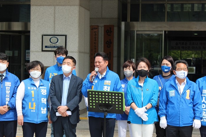 | ▲최대호 안양시장 후보 19일 기자회견 모습.(사진=후보실) |