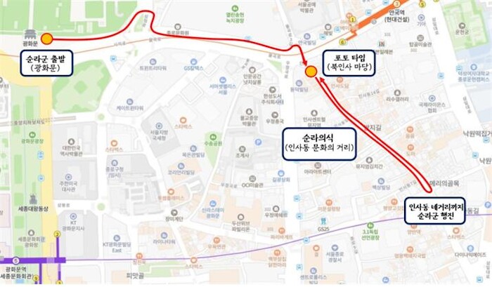 행사 동선은 광화문 출발→ 북인사 마당(출연자 도열) → 인사동 네거리에서 행렬 복귀→ 북인사 마당(포토타임) → 광화문 복귀다.
