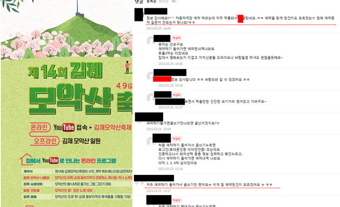 | ▲제14회 김제모악산축제 포스터와 김제시 한 커뮤니티에서의 모악산 축제 관련글(사진=김제시, 온라인 커뮤니티 갈무리) |