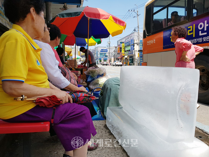 [세계로컬신문 조주연 기자] 2일 오전 전북 김제시의 한 버스정류장에 대형 얼음덩어리가 등장했다. 연일 이어지는 폭염 속에 김제시 안전총괄과측이 버스를 기다리는 시민들을 위해 가져다 놓은 것으로 보인다.