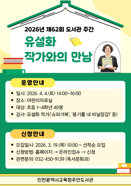 주안도서관 관계자는 “제62회 도서관 주간을 맞아 어린이 독자들이 유설화 작가와 소통하며 작품을 깊이 있게 이해하는 소중한 시간이 되길 바란다”며 “앞으로도 지역사회를 위해 풍성한 독서 문화 행사를 지속적으로 제공하겠다”고 밝혔다.