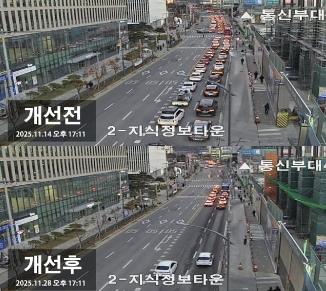 과천시는 정체 해소 방안 마련을 위해 인공지능 기반 스마트 교차로 시스템을 활용해 일정 기간 지식정보타운 일대의 교통량을 모니터링하고 실시간 정보를 수집했다. 수집된 자료를 분석해 과천대로(지식정보타운 구간)의 기존 신호주기를 254초에서 230초로 조정하고, 과천대로7길과 8길(동서축)의 신호시간을 늘렸다.