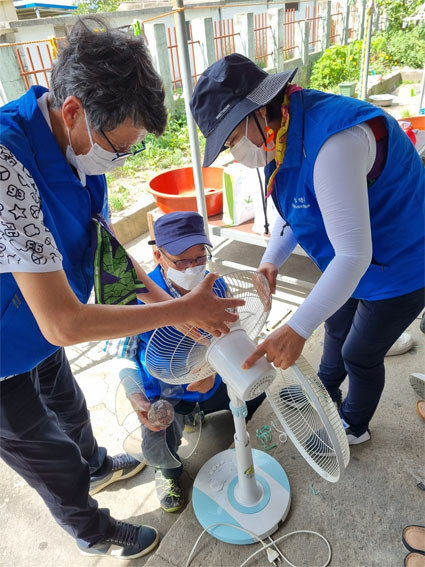 | ▲ 군동면지사협회원들의 선풍기 수리 모습.(사진=강진군 제공) |