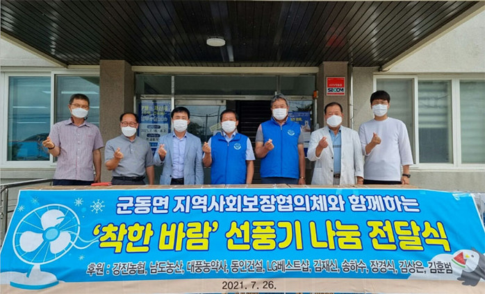 착한바람 선풍기사업을 위해 강진농협(조합장 정옥태), 남도농산(대표 문희숙), 대풍농약사(대표 배형복), 동인건설(대표 나동연), LG베스트샵(대표 정종훈), 장경식(호동마을 이장), 김재신(양산마을 이장), 송하수(동동마을 이장), 김상은(공무원), 김훈범(공무원) 등 지역 업체와 주민들이 동참했다.