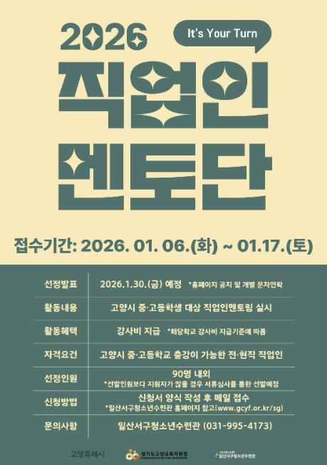 2026 직업인멘토단은 올해 3월 위촉식을 시작으로 4월부터 12월까지 활동하며, 평일 고양시 중·고등학교 출강이 가능한 다양한 직업군의 전현직 직업인 90명 내외를 모집할 예정이다.