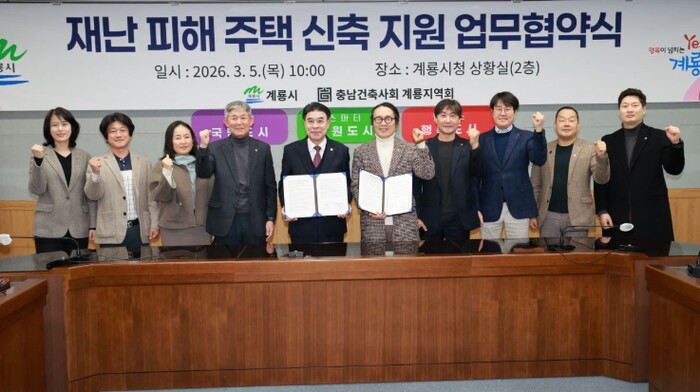 이날 협약식에는 이응우 계룡시장과 류욱형 회장을 비롯한 건축사회 관계자들이 참석해 재난 피해 시민의 주거 안정을 위해 상호 협력하기로 뜻을 모았다.