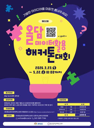 이번 해커톤은 충청남도가 주최하고 충남혁신센터가 주관하는 사업으로, 충청남도 공공데이터포털 '올담'의 데이터를 활용해 사회 문제 해결을 위한 창의적인 아이디어를 발굴하고 공공데이터 활용을 활성화하고자 마련됐다.