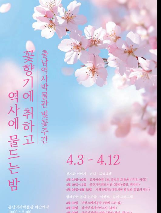 장기승 충청남도역사문화연구원장은 “이번 벚꽃 주간은 역사와 예술, 그리고 지역사회가 함께 어우러지는 풍성한 문화의 장이 될 것”이라며, “가족, 연인, 친구와 함께 박물관을 방문해 꽃향기에 취하고 역사에 물드는 아름다운 봄밤의 추억을 만들어 가시길 바란다”고 전했다.