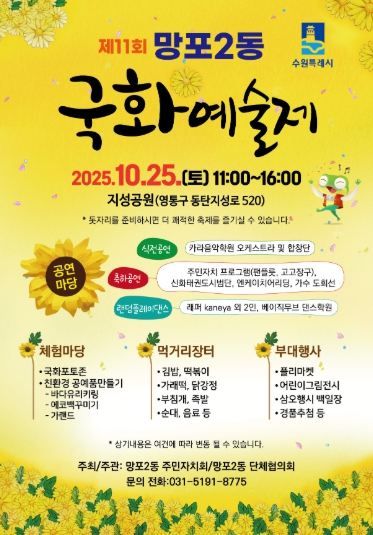이해록 망포2동 주민자치회 회장은 “이번 국화예술제를 통해 주민 모두가 함께하고 즐기는 문화축제를 만들고자 한다. 주민분들의 많은 관심과 참여를 바란다”고 전했다.