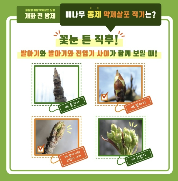 특히 개화 전후는 감염 위험이 높은 시기로, 배는 꽃눈이 튼 직후인 발아기부터 전엽기 사이에 방제하는 것이 효과적이다. 사과는 꽃눈이 트고 녹색 잎이 보이기 시작하는 녹색기부터 전엽기 사이에 약제를 살포해야 예방 효과를 높일 수 있다.