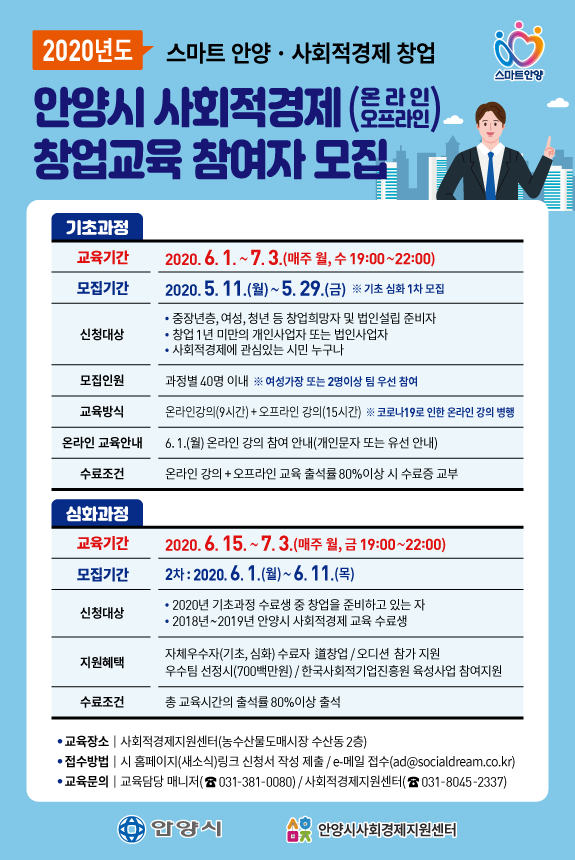 [세계로컬타임즈 최성우 기자] 안양시는 ‘스마트안양 사회적경제 창업’을 주제로 6월 1일부터 7월 3일까지 사회적경제 창업과정을 개설 및 창업에 대한 지식 전수에 나선다.