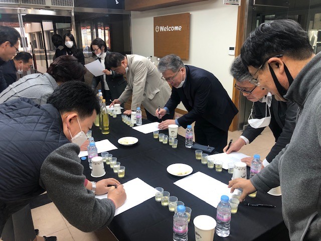 | ▲고로쇠 수액청주 관능검사 모습 (사진=경남농기원) |