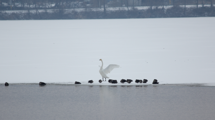 큰고니는 긴 목과 노란 부리에 흰색 깃털의 백조로써 유럽과 러시아 일대에서 번식하며 우리나라의 왕송호수 등지로 남하 이동해 월동하는 겨울철에 희귀하게 만나볼 수 있는 철새다.