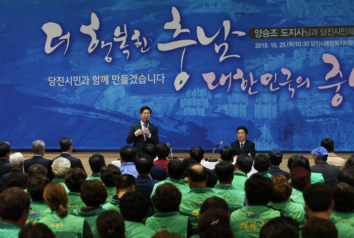 | ▲양승조(가운데) 충남도지사는 취임 후 처음으로 당진시를 공식 방문해 충남도정을 설명하고 있다. (사진=충남도 제공) |