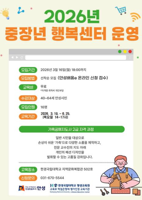 안성시 관계자는 “중장년 세대가 새로운 기술을 배우고 이를 경제활동으로 연결할 수 있도록 실효성 있는 프로그램을 지속 확대하겠다”며 “앞으로도 시민 수요를 반영한 맞춤형 평생학습 정책을 적극 추진하겠다”고 밝혔다.