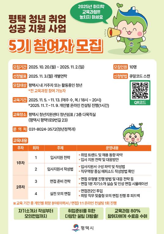 5기 교육은 11월 5일부터 13일까지 2주 / 4회 (수, 목) 18:00~20:00 평택시 청년 지원센터 ‘청년쉼,표’에서 진행되며 △취업트렌드 및 공개채용 동향 파악 △입사지원서 작성법 및 직무역량 중심 에피소드 작성법 △면접 유형별 진행 방법 및 대응 전략 △면접 1분 자기소개 실습 및 인성 면접 시뮬레이션 △실전 모의면접을 진행하며 교육 기간 중 1:1 개별 온라인 컨설팅이 제공된다.