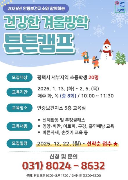 안중보건지소 관계자는 “겨울방학 동안 아이들이 즐겁게 참여하면서 스스로 건강한 생활 습관을 익힐 수 있도록 프로그램을 준비했다”며 성장기 아동의 건강한 성장을 위해 이번 튼튼 캠프에 많은 관심과 참여를 부탁드린다”고 말했다.