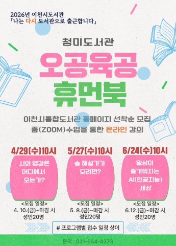 운영 강좌는 성인들을 대상으로 총 3회에 걸쳐 진행된다. 4월 29일 ▲시의 영감은 어디에서 오는가?, 5월 27일 ▲ 숲 해설가가 되려면?, 6월 24일 ▲일상이 즐거워지는 AI(인공지능) 세상으로 구성되며 줌(ZOOM)수업을 통해 온라인으로 진행된다.